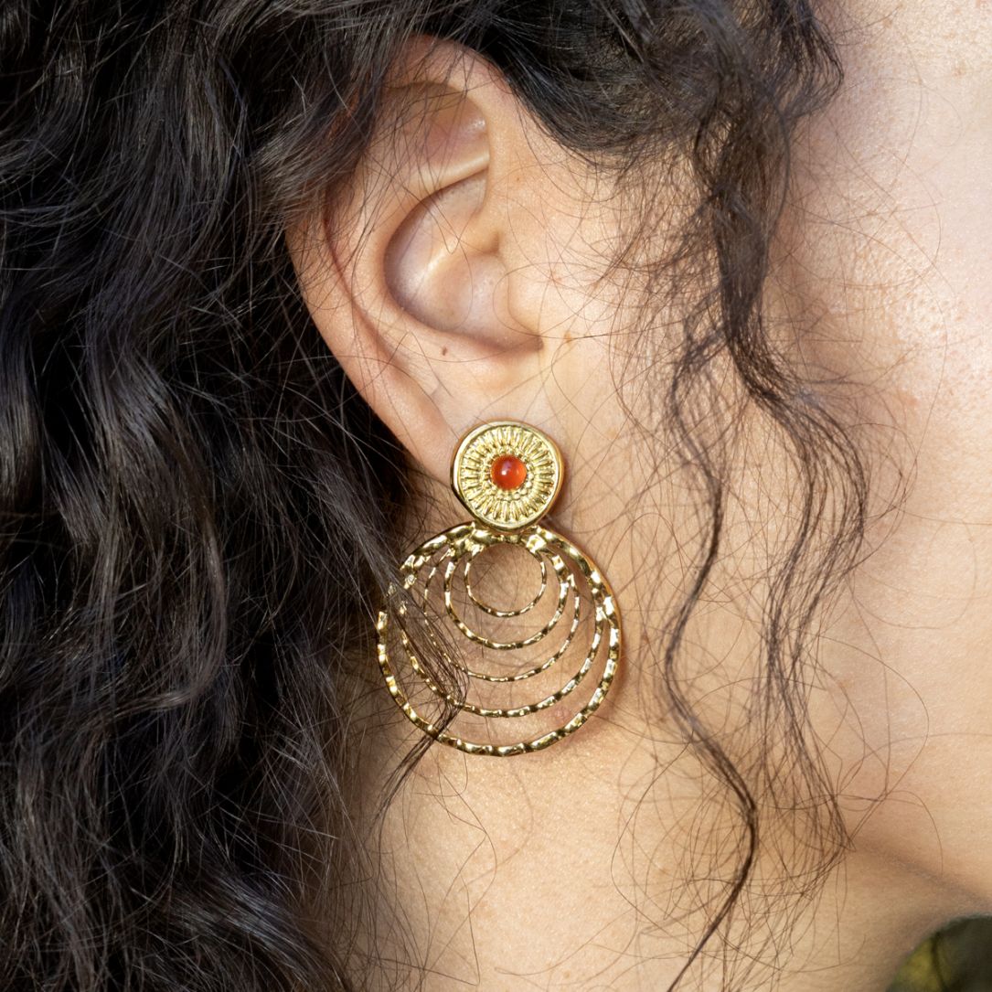 Élégantes et dynamisantes, les boucles d'oreilles Jody marient l'éclat de l'acier doré aux nuances chaudes de la Cornaline naturelle.