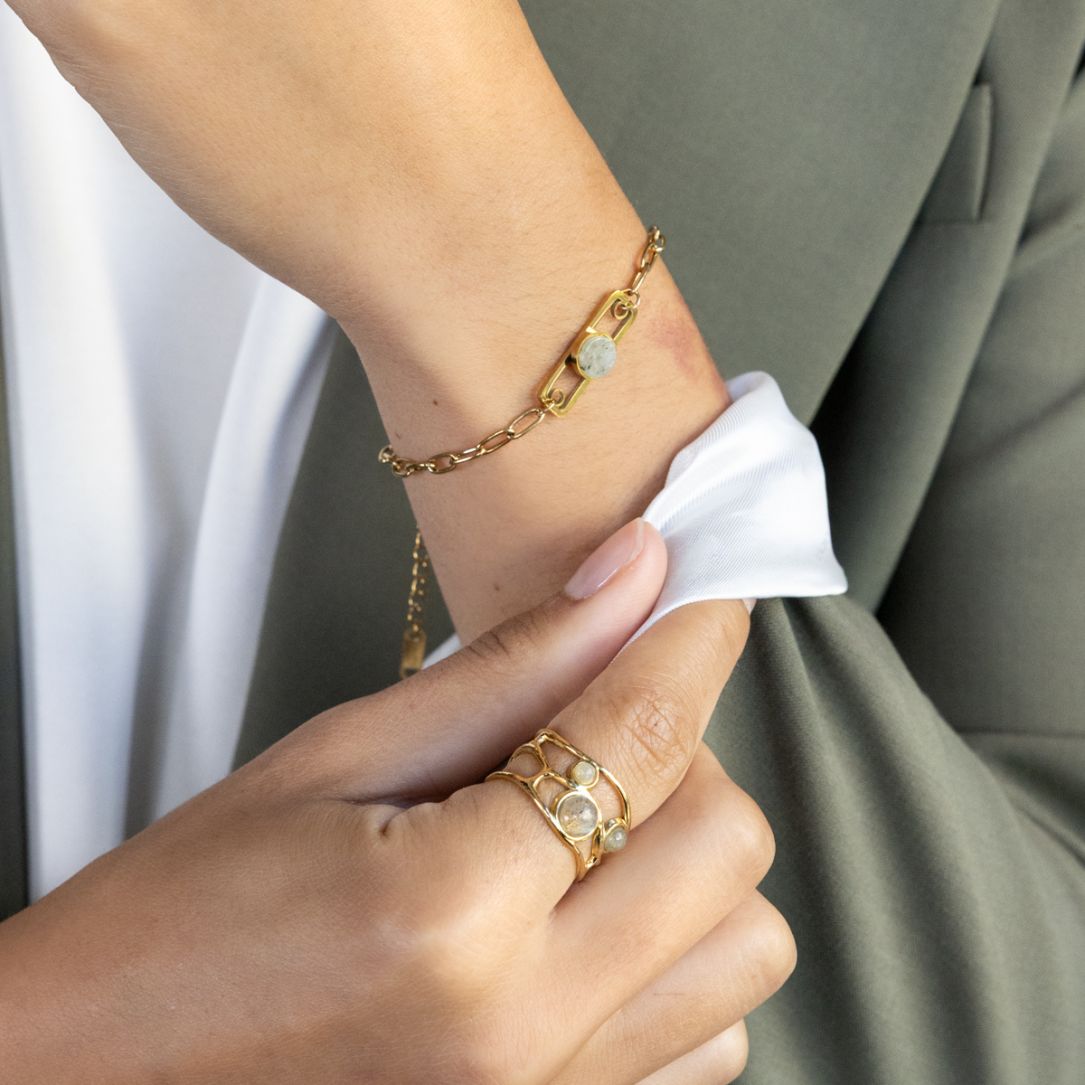 Sublimez votre poignet avec le bracelet Aude en Labradorite véritable et acier inoxydable doré. Un bijou protecteur et ajustable pour un style unique.