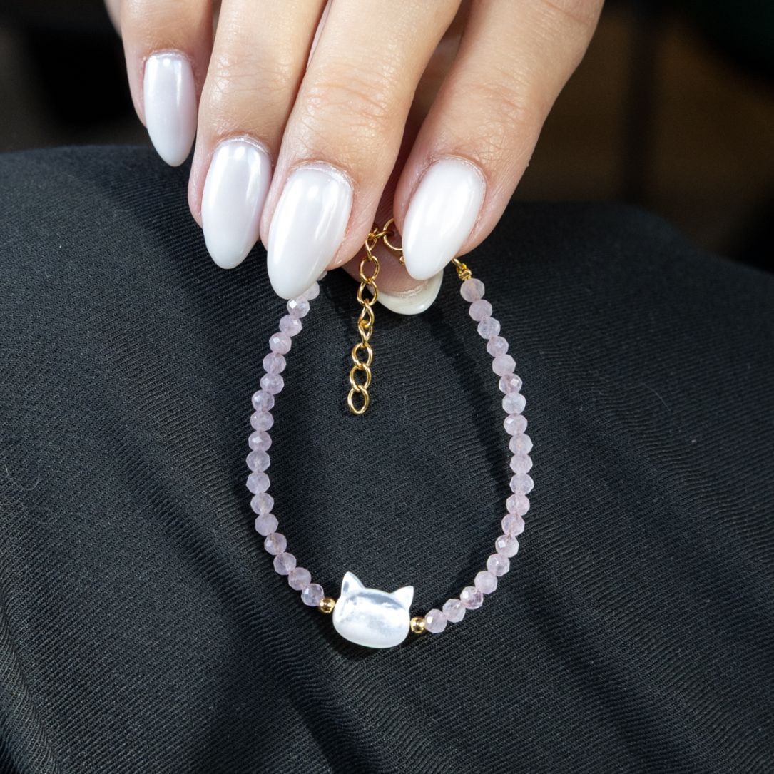 Bracelet réglable enfant en quartz rose et nacre (poignet de 12 cm à 15 cm)