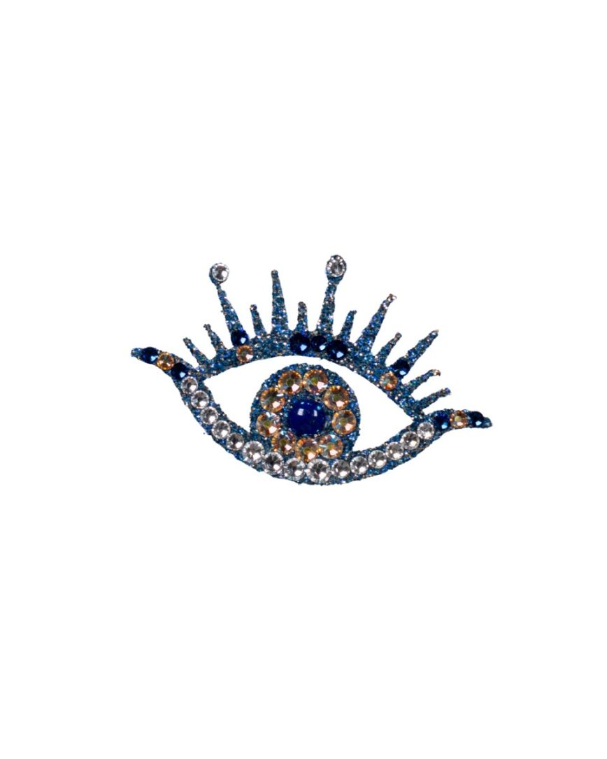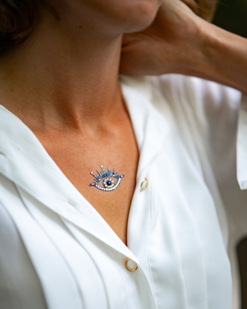 bijou de peau en forme d’oeil (protection) incluant une pierre Lapis Lazuli à l’emplacement de la pupille